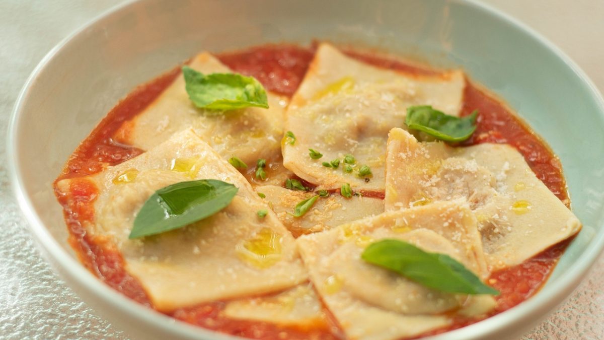 Aggiungere le verdure già saltate in una padella antiaderente. Bagnare con il vino rosso e far cuocere fino a evaporazione, quindi aggiungere la salsa di pomodoro, sale e pepe. Far cuocere coperto per 1 circa a fuoco moderato, avendo cura di mescolare di tanto in tanto durante la cottura.A questo punto prendere l’impasto che avrà riposato tirare la pasta in 2 sfoglie abbastanza sottili, su di una disporvi le palline con il ripieno di carne e quindi coprirla con l’altra, pigiando con delicatezza in modo da far aderire le sfoglie. Utilizzando l’apposita rotella tagliapasta, tagliare la sfoglia ripiena a forma quadrata di circa 5 cm per lato, quindi sistemare i ravioloni ottenuti in un contenitore.